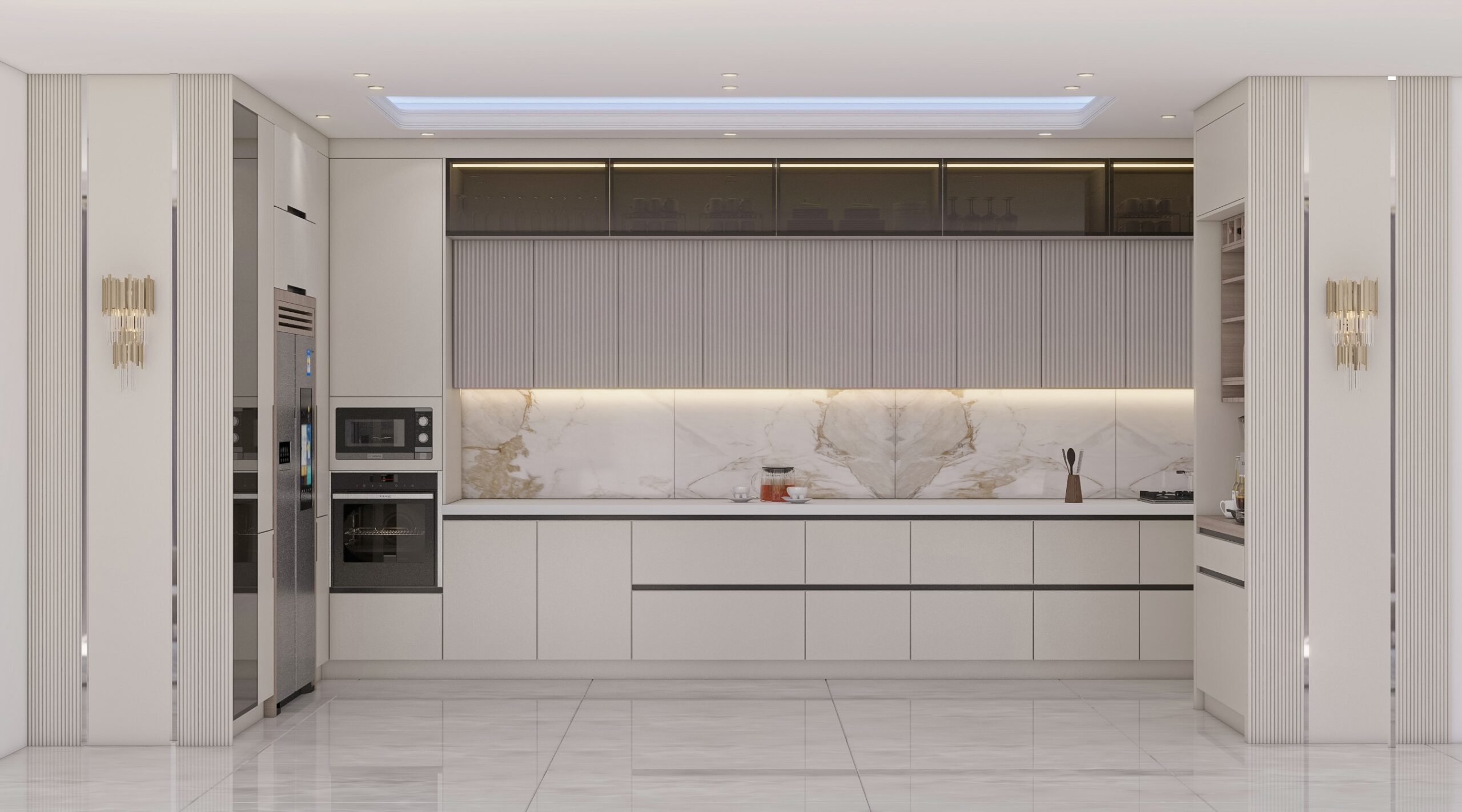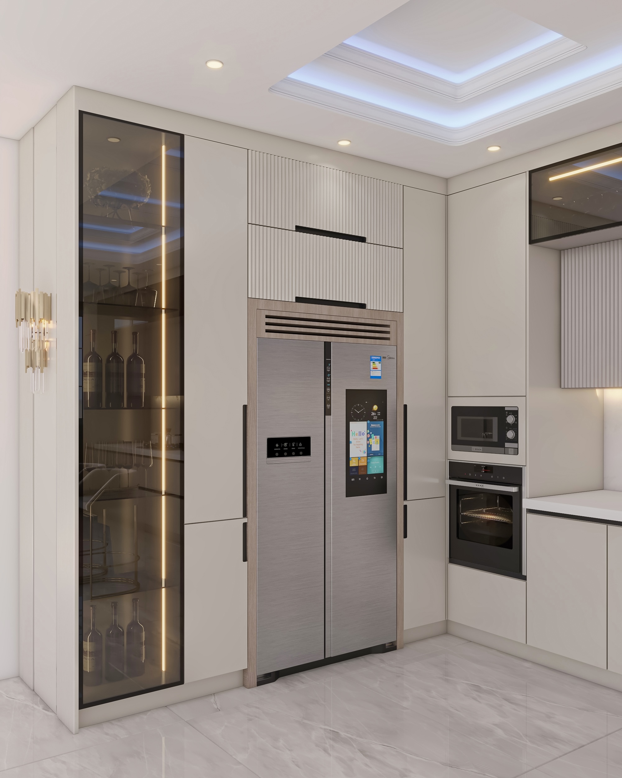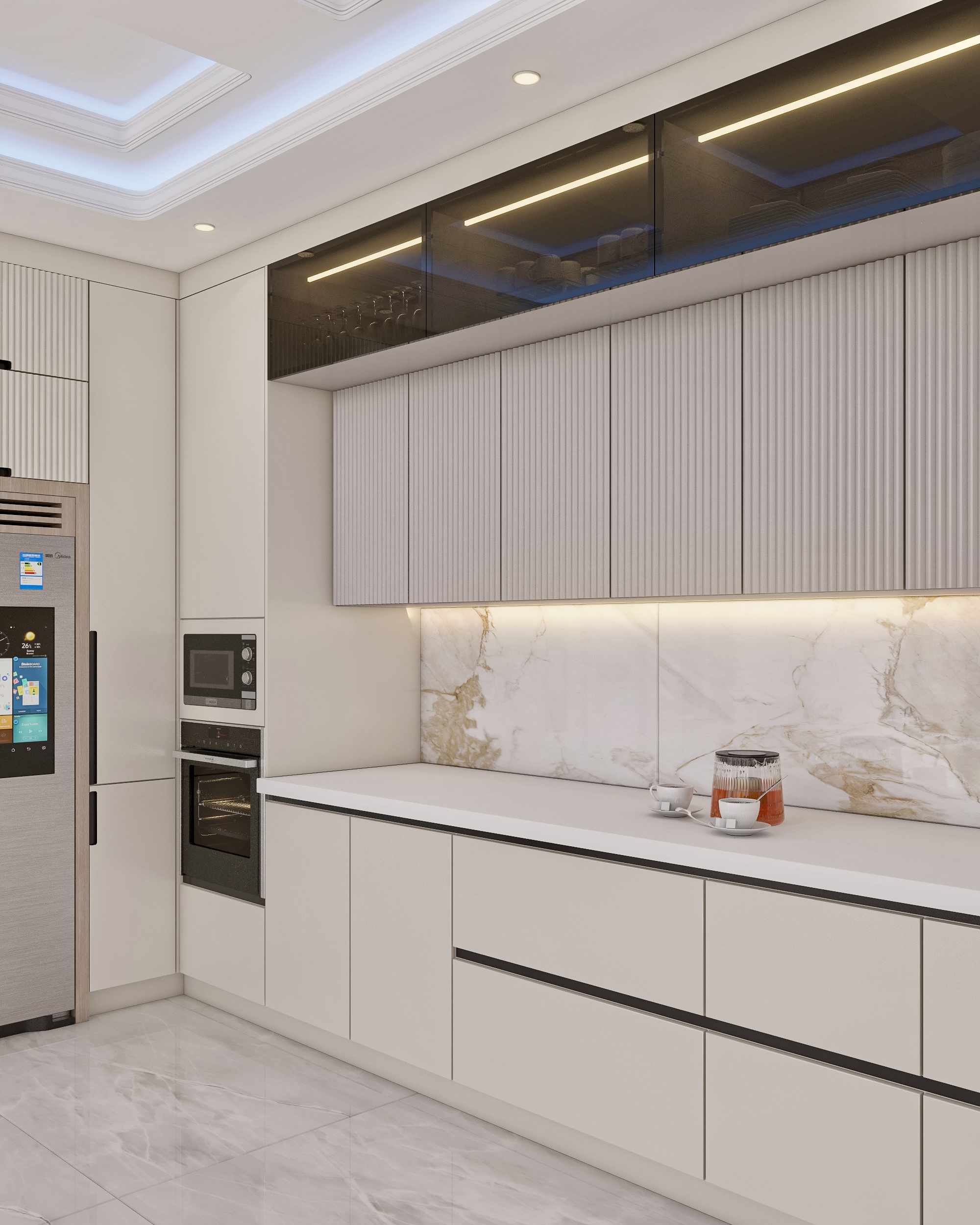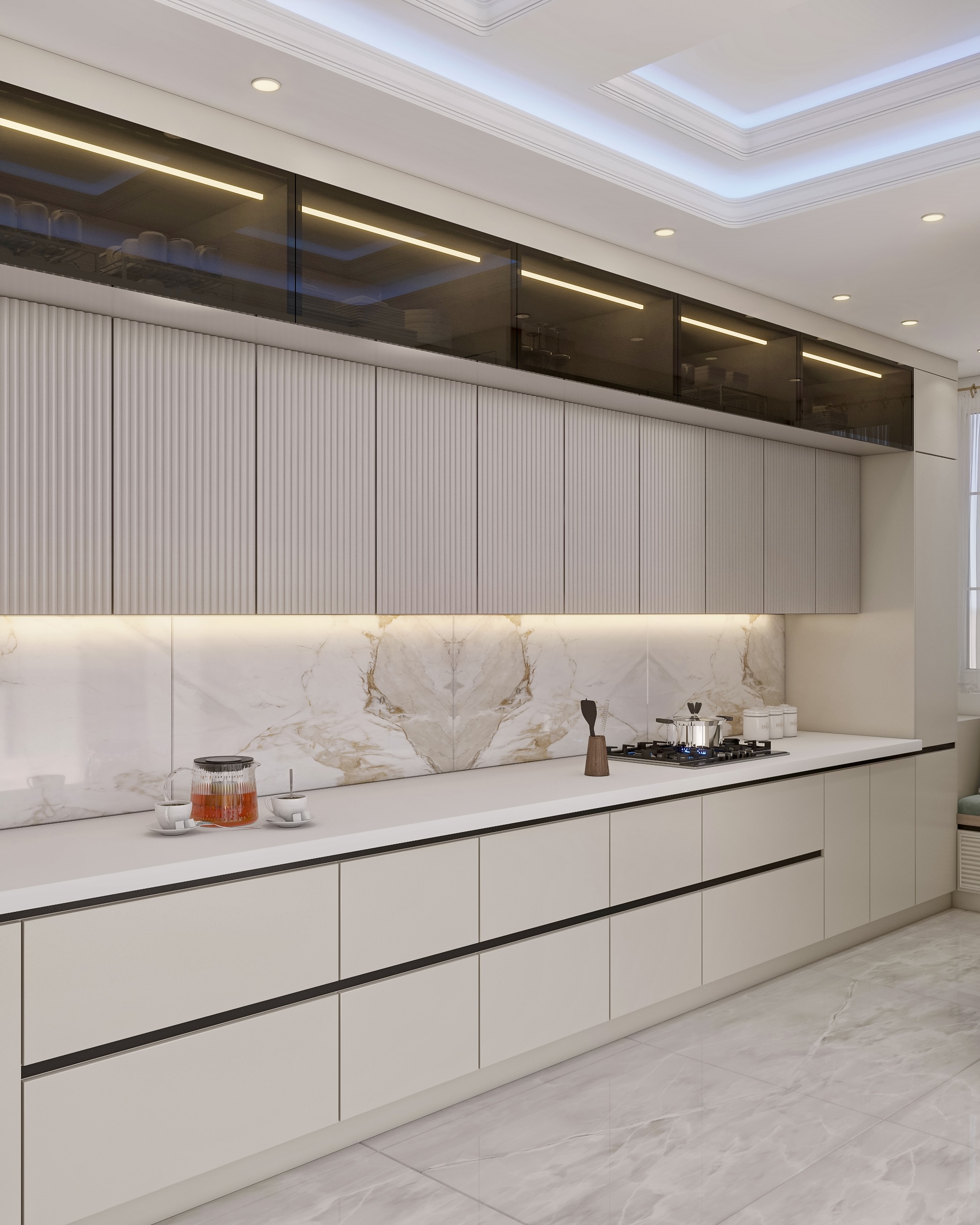 این آشپزخانه مدرن که توسط گروه طراحی داخلی آیرا اجرا شده، ترکیبی از سادگی و ظرافت را در قالب یک فضای لوکس و کاربردی ارائه میدهد. رنگ کابینتها در ترکیب دو رنگ طوسی بسیار ملایم و کرم استخوانی انتخاب شده که حس آرامش و هماهنگی را به فضا میبخشد. در طراحی کابینتهای هوایی، از دربهای میلهای شیاردار استفاده شده که در کنار کابینتهای شیشهای دودی و لاین نوری، جلوهای مدرن و شیک ایجاد کرده است. همچنین، طراحی کابینتهای پایینی بدون دستگیره و با خطوط مشکی مینیمال، سبک مینیمالیستی را به بهترین شکل تکمیل کرده است.