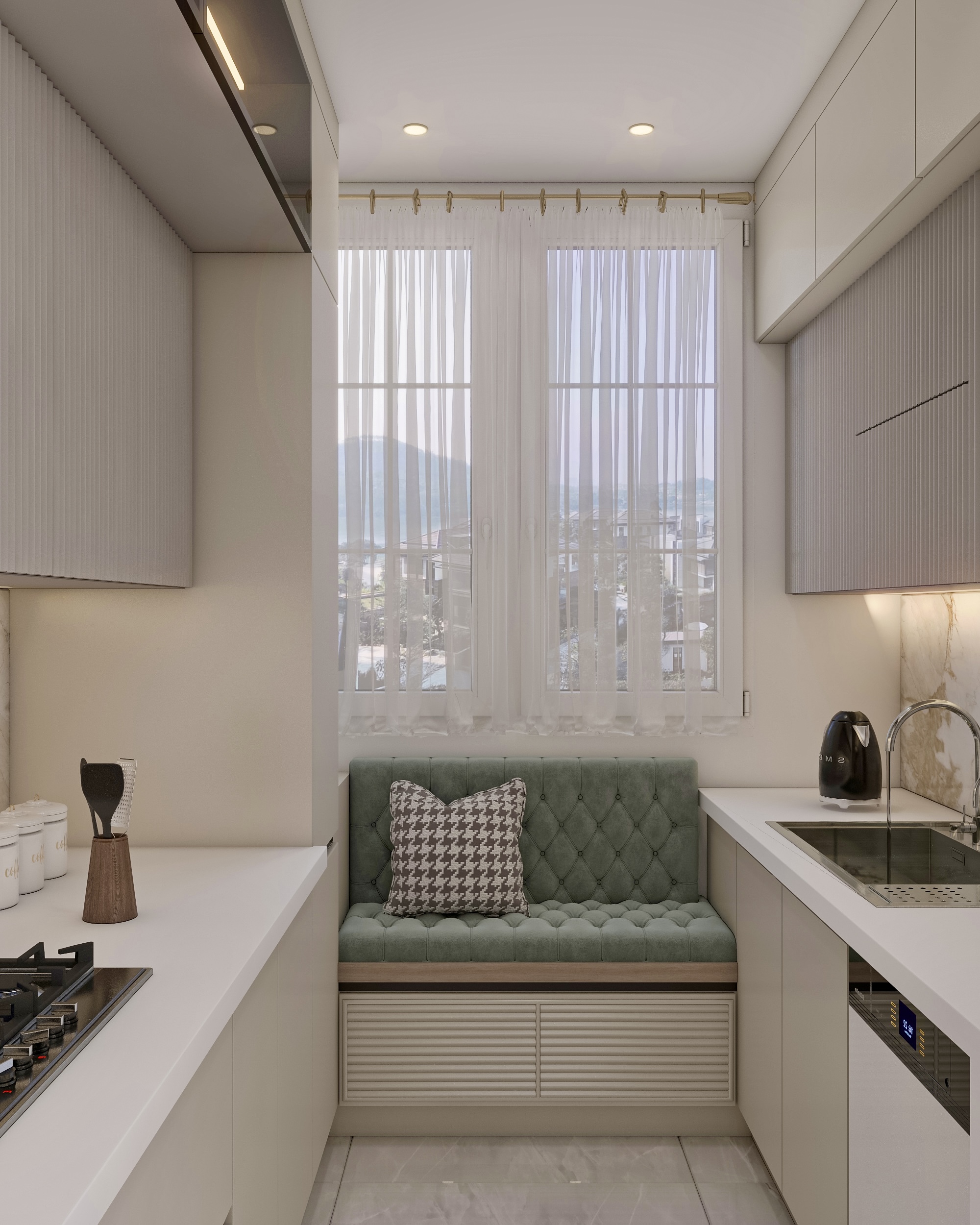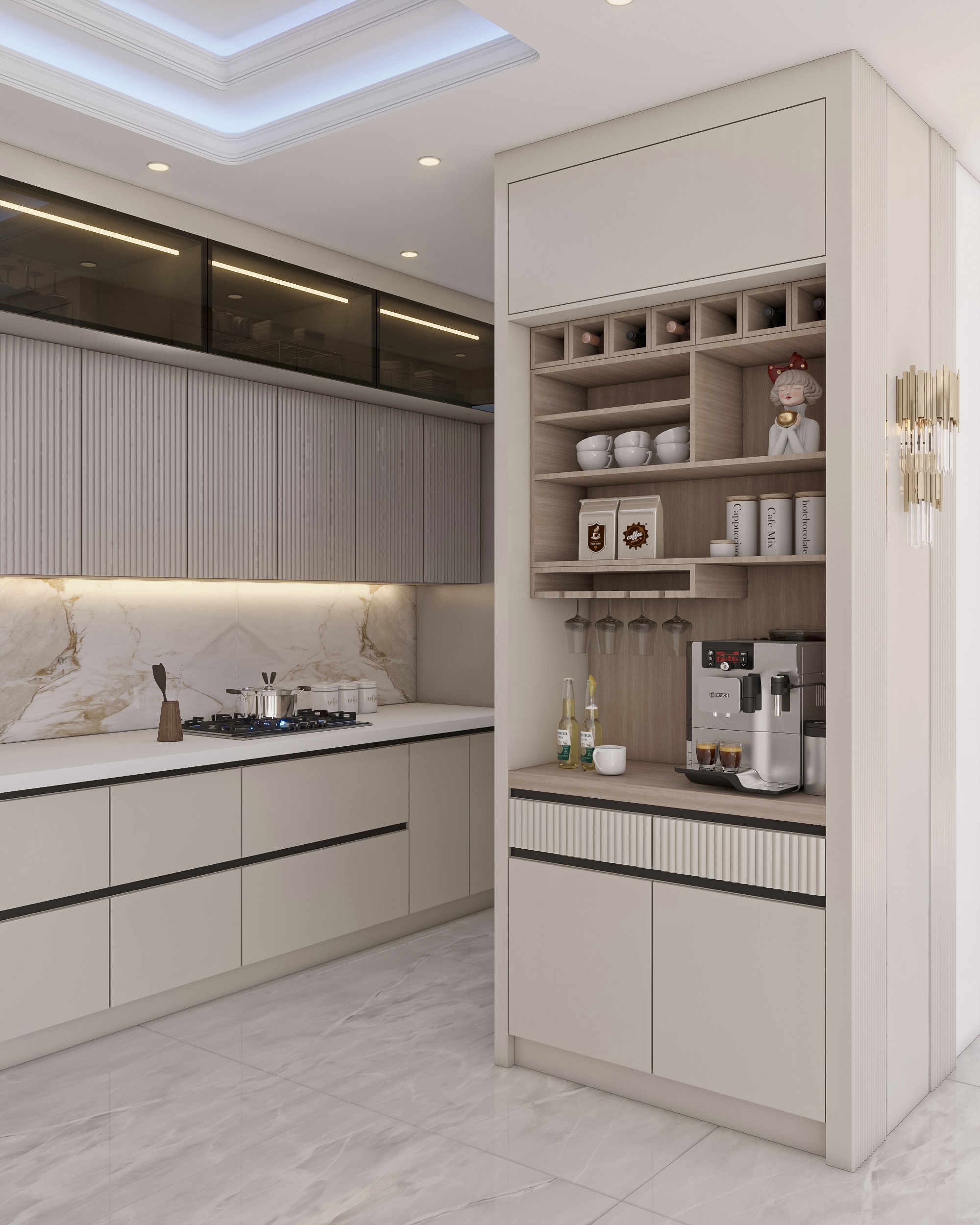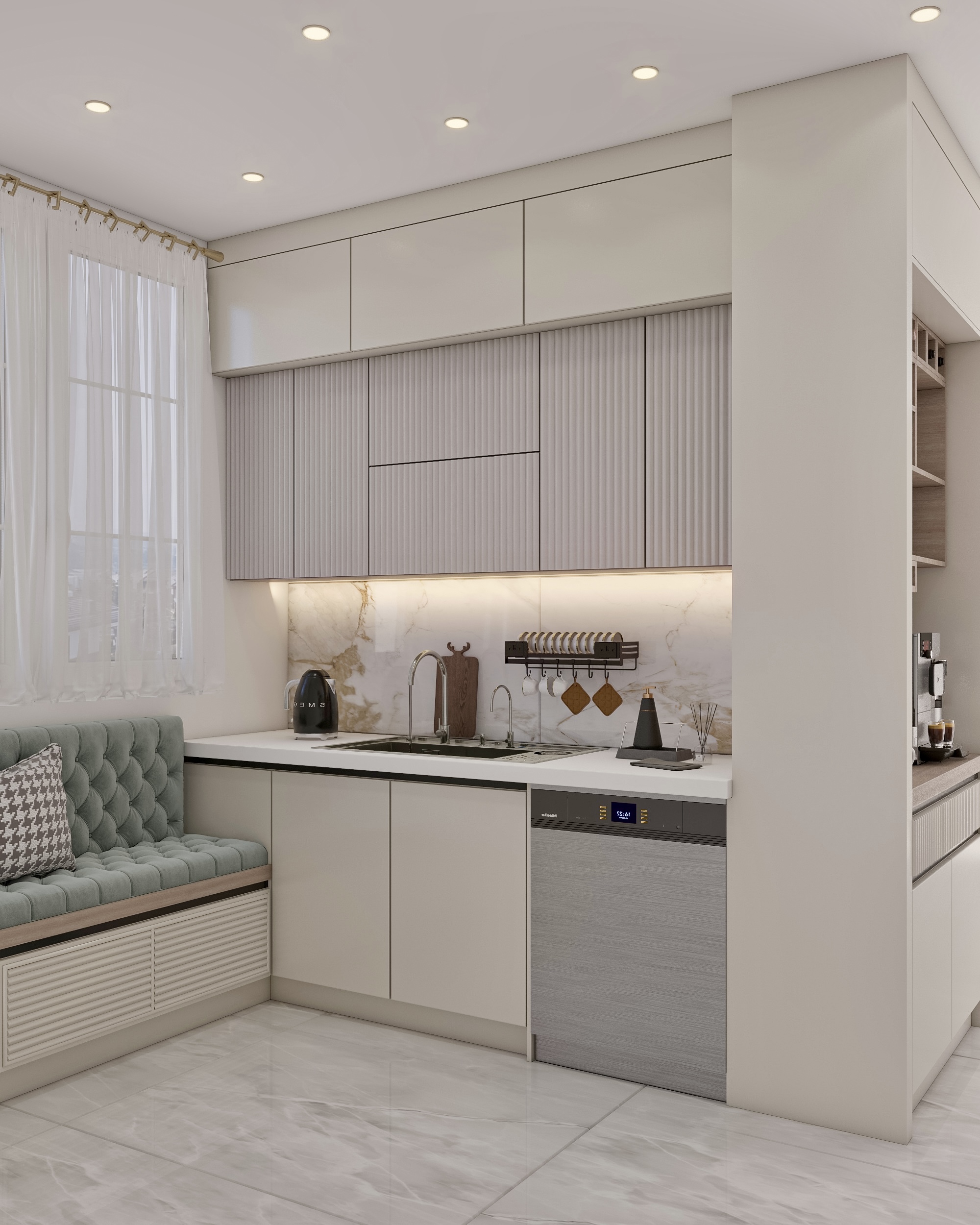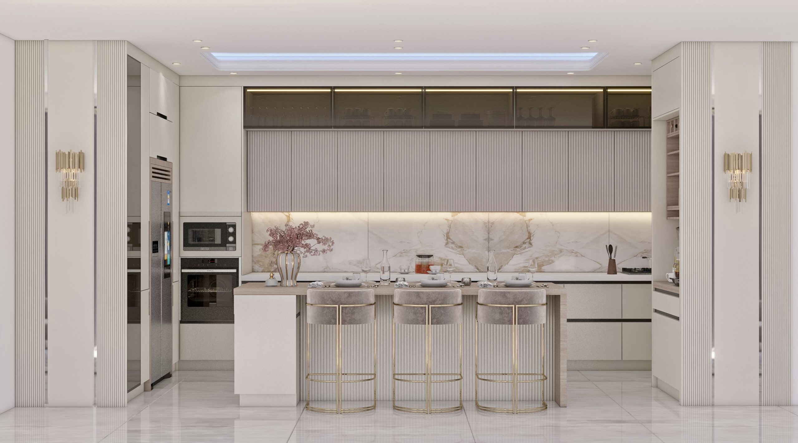 این آشپزخانه مدرن که توسط گروه طراحی داخلی آیرا اجرا شده، ترکیبی از سادگی و ظرافت را در قالب یک فضای لوکس و کاربردی ارائه میدهد. رنگ کابینتها در ترکیب دو رنگ طوسی بسیار ملایم و کرم استخوانی انتخاب شده که حس آرامش و هماهنگی را به فضا میبخشد. در طراحی کابینتهای هوایی، از دربهای میلهای شیاردار استفاده شده که در کنار کابینتهای شیشهای دودی و لاین نوری، جلوهای مدرن و شیک ایجاد کرده است. همچنین، طراحی کابینتهای پایینی بدون دستگیره و با خطوط مشکی مینیمال، سبک مینیمالیستی را به بهترین شکل تکمیل کرده است.